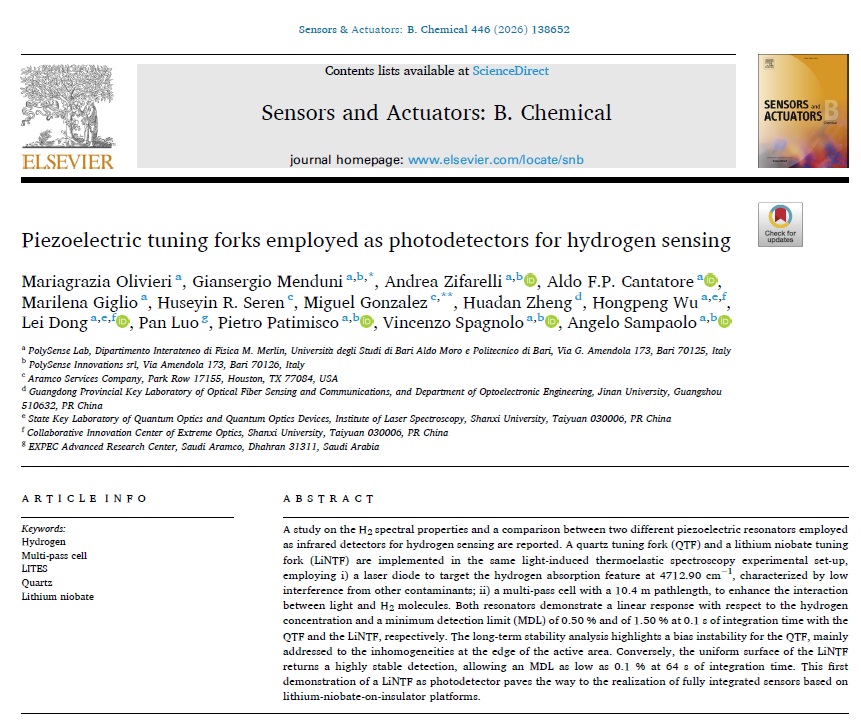The PolySense team has just published  a new article on Sensors and Actuators B Chemical Journal Elsevier (IF 7.7)  reporting on a study on the H2 spectral properties and a comparison between two different piezoelectric resonators employed as infrared detectors for hydrogen sensing are reported. A quartz tuning fork (QTF) and a lithium niobate tuning fork (LiNTF) are implemented in the same light-induced thermoelastic spectroscopy experimental set-up. Both resonators demonstrate a linear response with respect to the hydrogen concentration and a minimum detection limit (MDL) of 0.50 % and of 1.50 % at 0.1 s of integration time with the QTF and the LiNTF, respectively. The long-term stability analysis highlights a bias instability for the QTF, mainly addressed to the inhomogeneities at the edge of the active area. Conversely, the uniform surface of the LiNTF returns a highly stable detection, allowing an MDL as low as 0.1 % at 64 s of integration time. This first demonstration of a LiNTF as photodetector paves the way to the realization of fully integrated sensors based on lithium-niobate-on-insulator platforms.