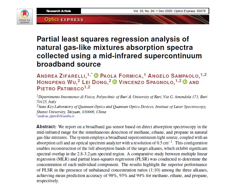 The PolySense team has just published a new article on OSA Optics Express (IF 3.3) reporting on a broadband gas sensor based on direct absorption spectroscopy in the mid-infrared range for the simultaneous detection of methane, ethane, and propane in natural gas-like mixtures. The system employs a broadband supercontinuum light source, coupled with an absorption cell and an optical spectrum analyzer with a resolution of 0.5cm−1. A comparative study between multiple linear regression (MLR) and partial least-squares regression (PLSR) was conducted to determine the concentration of each individual component. The results highlight the superior performance of PLSR in the presence of unbalanced concentration ratios (1:10) among the three alkanes, achieving mean prediction accuracy of 98%, 93% and 94% for methane, ethane, and propane, respectively.
