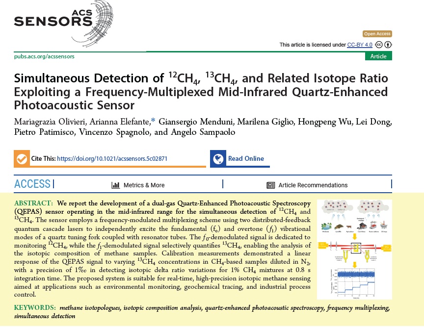 The PolySense and Polysense Innovations teams have just published  a new article on ACS Sensors Journal (IF 9.1)  reporting on the development of a dual-gas Quartz-Enhanced Photoacoustic Spectroscopy (QEPAS) sensor operating in the mid-infrared range for the simultaneous detection of 12CH4 and 13CH4. The sensor employs a frequency-modulated multiplexing scheme using two distributed-feedback quantum cascade lasers to independently excite the fundamental (fo) and overtone (f1) vibrational modes of a quartz tuning fork coupled with resonator tubes. Calibration measurements demonstrated a linear response of the QEPAS signal to varying 13CH4 concentrations in CH4-based samples diluted in N2, with a precision of 1‰ in detecting isotopic delta ratio variations for 1% CH4 mixtures at 0.8 s integration time. The proposed system is suitable for real-time, high-precision isotopic methane sensing aimed at applications such as environmental monitoring, geochemical tracing, and industrial process control.
