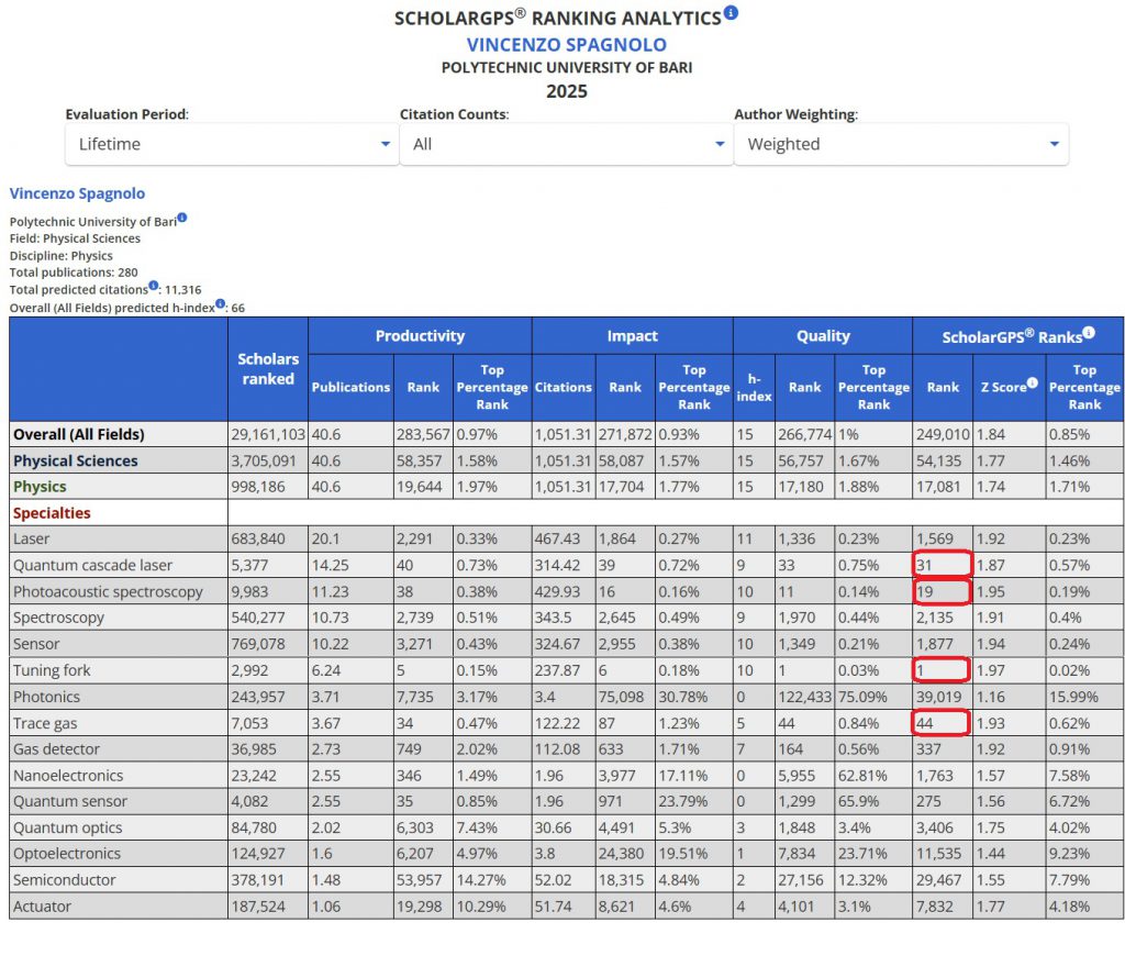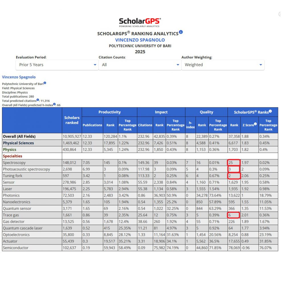 Professor Vincenzo Spagnolo (Polytechnic University of Bari) has been included in the ScholarGPS 2025 Global Rankings, which evaluate scholars worldwide using objective indicators of scientific productivity, citation impact, and research quality.