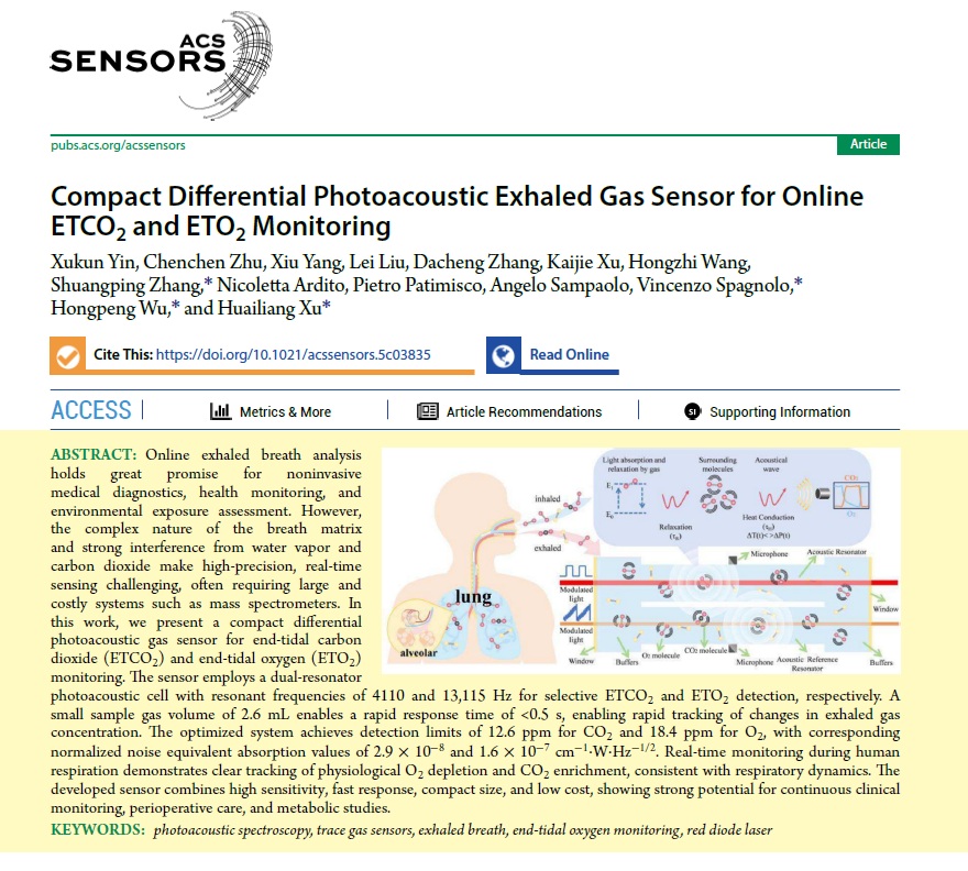 The PolySense and Polysense Innovations teams have just published a new article on ACS Sensors Journal (IF 9.1) reporting on a compact differential photoacoustic gas sensor for end-tidal carbon dioxide (ETCO2) and end-tidal oxygen (ETO2) monitoring. The sensor employs a dual-resonator photoacoustic cell with resonant frequencies of 4110 and 13,115 Hz for selective ETCO2 and ETO2 detection, respectively. A small sample gas volume of 2.6 mL enables a rapid response time of <0.5 s, enabling rapid tracking of changes in exhaled gas concentration. The optimized system achieves detection limits of 12.6 ppm for CO2 and 18.4 ppm for O2, with corresponding normalized noise equivalent absorption values of 2.9 × 10−8 and 1.6 × 10−7 cm−1⋅W⋅Hz−1/2. Real-time monitoring during human respiration demonstrates clear tracking of physiological O2 depletion and CO2 enrichment, consistent with respiratory dynamics. The developed sensor combines high sensitivity, fast response, compact size, and low cost, showing strong potential for continuous clinical monitoring, perioperative care, and metabolic studies.