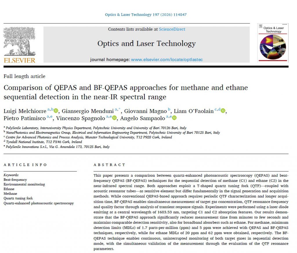The PolySense and Polysense Innovations teams have just published a new article on Optics & Laser Technology journal (IF 5.0) reporting on a comparison between quartz-enhanced photoacoustic spectroscopy (QEPAS) and beat-frequency QEPAS (BF-QEPAS) techniques for the sequential detection of methane (C1) and ethane (C2) in the near-infrared spectral range. Experiments were performed using a laser diode emitting at a central wavelength of 1683.53 nm, targeting C1 and C2 absorption features. Our results demonstrate that the BF-QEPAS approach significantly reduces measurement time from minutes to few seconds and maintains comparable detection sensitivity, also for broadband absorbers such as ethane. For methane, minimum detection limits (MDLs) of 1.7 parts-per-million (ppm) and 5 ppm were achieved with QEPAS and BF-QEPAS techniques, respectively, while for ethane MDLs of 20 ppm and 62 ppm were obtained, respectively. The BF-QEPAS technique enables continuous, uninterrupted monitoring of both target gases in sequential detection mode, with the simultaneous validation of the measurement through the evaluation of the QTF resonance parameters.