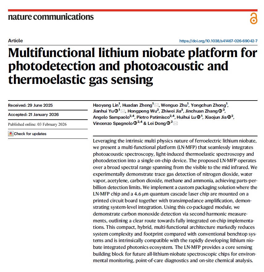 The PolySense and Polysense Innovations teams have just published  a new article on Nature Communications Journal (IF=15.7) reporting on a multi-functional platform (LN-MFP) that seamlessly integrates photoacoustic spectroscopy, light-induced thermoelastic spectroscopy and photodetection into a single on-chip device. The proposed LN-MFP operates over a broad spectral range spanning from the visible to the mid infrared. We experimentally demonstrate trace gas detection of nitrogen dioxide, water vapor, acetylene, carbon dioxide, methane and ammonia, achieving parts-per billion detection limits.We implement a custom packaging solution where the LN-MFP chip and a 4.6 μm quantum cascade laser chip are mounted on a printed circuit board together with transimpedance amplification, demonstrating system-level integration. Using this co- packaged module, we demonstrate carbon monoxide detection via second-harmonic measurements, outlining a clear route towards fully integrated on-chip implementations. This compact, hybrid, multi-functional architecture markedly reduces system complexity and footprint compared with conventional benchtop systems and is intrinsically compatible with the rapidly developing lithium niobate integrated photonics ecosystem. The LN-MFP provides a core sensing building block for future all-lithium-niobate spectroscopic chips for environmental monitoring, point-of-care diagnostics and on-site chemical analysis.