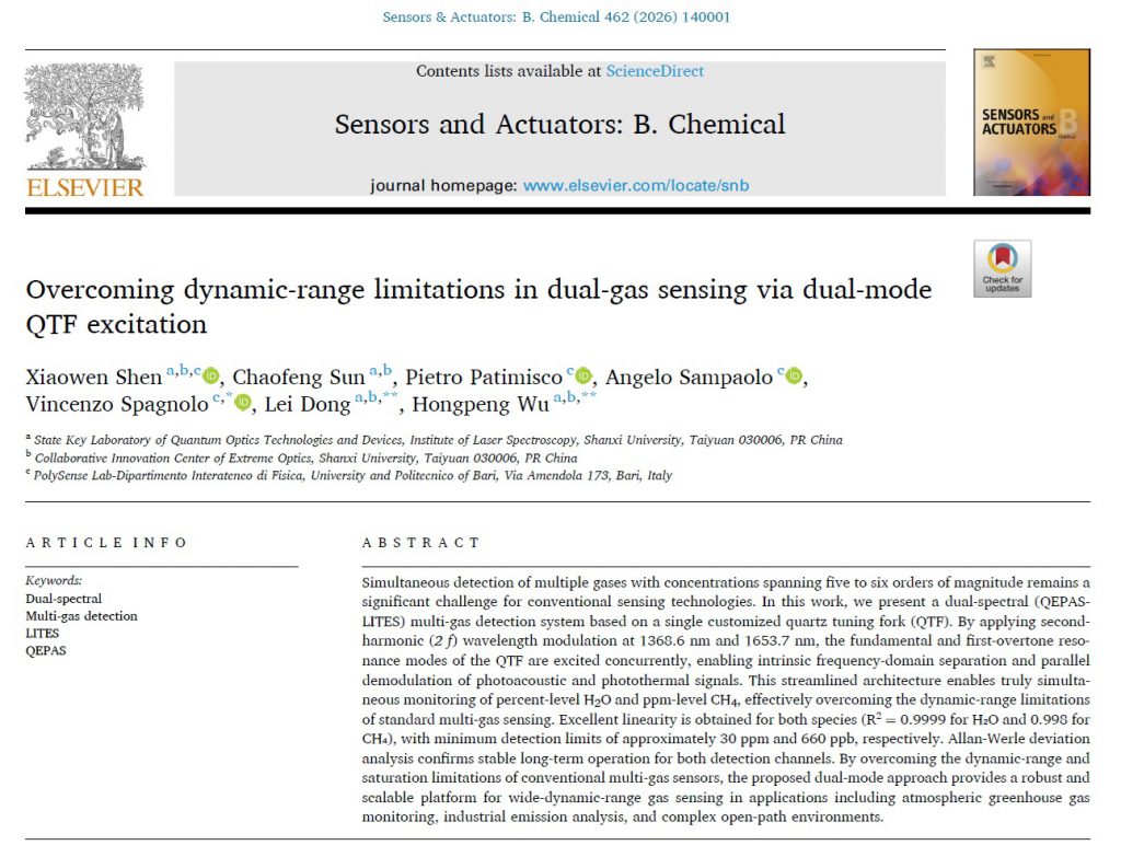 The PolySense and Polysense Innovations teams have just published a new article on Sensors and Actuators B Chemical Journal (IF 7.7) reporting on a dual-spectral (QEPAS-LITES) multi-gas detection system based on a single customized quartz tuning fork (QTF). By applying second-harmonic (2 f) wavelength modulation at 1368.6 nm and 1653.7 nm, the fundamental and first-overtone resonance modes of the QTF are excited concurrently, enabling intrinsic frequency-domain separation and parallel demodulation of photoacoustic and photothermal signals.